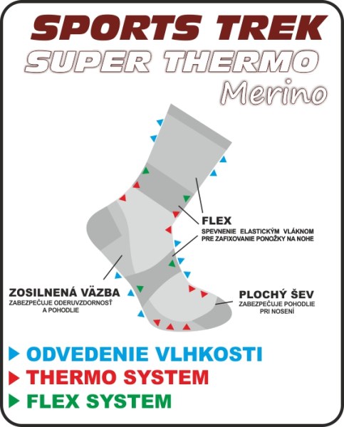 - Thermo System - kombinácia vlny a polypropylénu zvyšuje odolnosť a životnosť vlákna. Ponožky vyrobené z tohoto materiálu zabezpečujú dlhú životnosť a vynikajúci tepelný komfort.